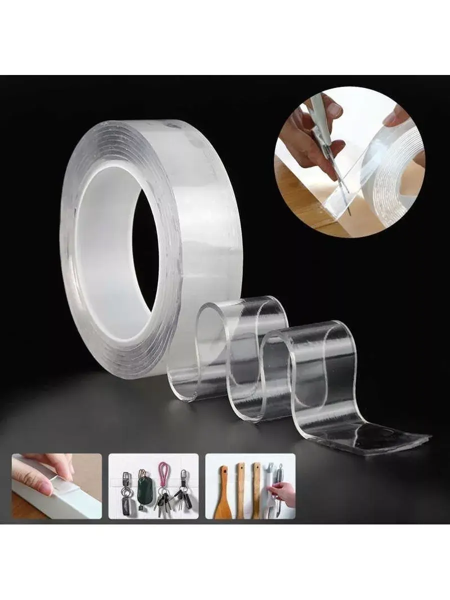 Двухсторонняя клейкая лента, многоразовая, водостойкая, акриловая Nano tape 2mm x 30mm x 3m Цвет: прозрачныйпростая в применениимногоразовое использованиеводостойкаябазовый цвет - прозрачныйочень высокие адгезионные качестване оставляет следовОбласть применения:Бытовая: приклеивание крючков, подвешивание предметов - кухонной утвари, картин и плакатов, телефонов в автомобиле и дома и промышленная: подвешивание инструментаВанная комната: крепление щеток и пасты, гостиная - крепление сетевого удлинителяХарактеристики:Ширина 30ммДлина ролика: 3мЦвет: прозрачныйОснова: нетоксичный прозрачный винилПокрытие: лайнерКлей: PU - полиуретан (сверхсильная адгезия)Толщина: 2мм.